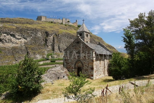 Description: cestování, dovolená, Evropa, Švýcarsko, Alpy, hory, kopec, vrchol, krajina, příroda, léto, barvy, romantika, výška, kanton, Wallis, pohoří, slunce, mraky, hrad,historie,tráva, kámen, kameny, rostlina, údolí, cesta, Sion,Tourbillon, kaple, kostel, křesťanství, kříž, středověk,náboženství, víra,vinice, víno, pěstování